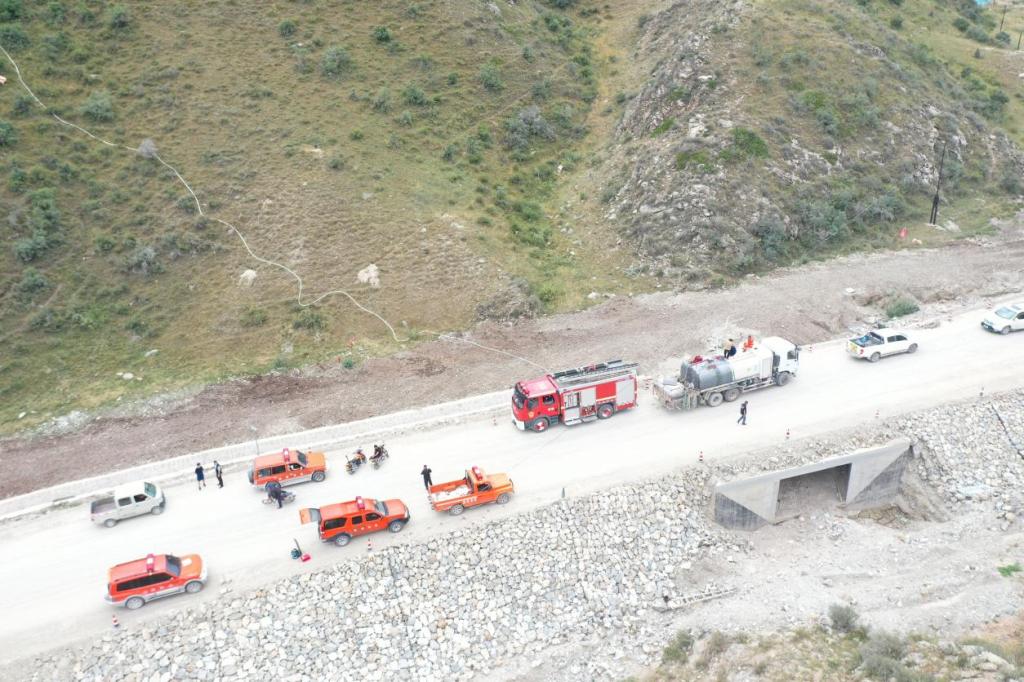 此次演练位于温泉县安格里格镇托斯沟林区,火情为模拟林区发生森林火灾的场景,共出动应急车辆9辆,消防车1辆,水罐车1辆,半专业化队伍30余人,携带无人机、水泵、背负式水枪、水带等消防设备。在演练现场,由生态护林员将发生火情的地点及坐标向总指挥报告,总指挥下令后,应急分队队员以及半专业化扑火队员迅速集结并携带扑火装备奔赴火灾现场。在现场指挥的统一调度下,队员们分工明确、协同作战,运用风力灭火机、灭火水枪等工具进行扑救,同时迅速开辟防火隔离带,防止火势蔓延。经过近5小时的奋力扑救,明火被成功扑灭,随后队员们对火场进行了清理和看守,确保不会发生复燃。