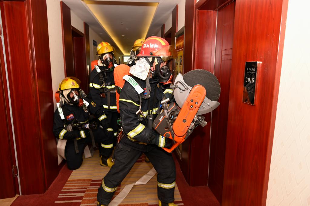 16时30分,演练正式开始,演练设置酒店七楼一房间着火,现场火势迅猛,室内充满有毒烟气,有两名人员被困。发生火灾后,单位工作人员立即向119消防指挥中心报警,同时组织本单位微型消防站人员利用内部消防设施进行自救,及时疏散现场人员。指挥中心迅速调集相关力量赶赴现场,当日全勤指挥部遂行出动。消防救援队伍到场后立即成立了火情侦察组、救援组、灭火组、破拆组、警戒组、供水组、安全员等,明确了任务和分工,开展救援行动。演练过程中,火情侦查组先后进行外部侦查、内部侦查、询问知情人、利用消防控制室等方式进行情况了解;救援组在水枪掩护下通过热成像仪、呼喊、破拆等方式对两名被困人员进行施救;灭火组利用垂直铺设水带和沿楼梯蜿蜒铺设水带在着火层下一层建立两个水枪阵地;供水组利用地下消火栓保证供水不间断。经过指战员的奋力扑救和全力搜救,两名被困人员全部救出,最终火势全部扑灭,全面检验了指战员面临火情的处置能力和协同配合能力。