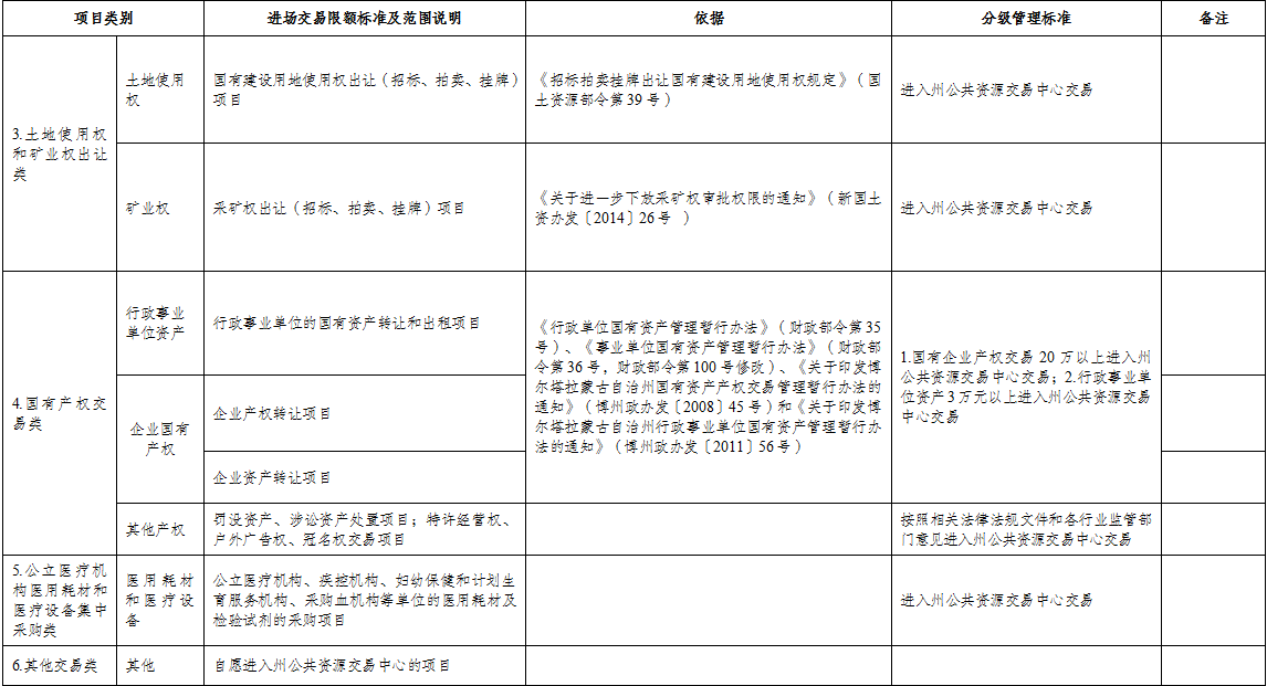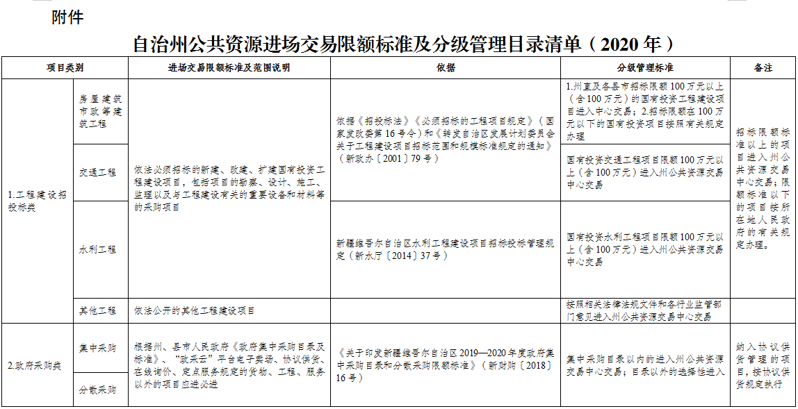 附件:自治州公共资源进场交易限额标准及分级管理目录清