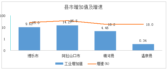 县市工业全部实现增长。各县市工业生产呈现出高速增长态势,博乐市实现工业增加值9.61亿元,同比增长25%;阿拉山口市14.27亿元、增长35.5%;精河县实现工业增加值4.46亿元、增长18.2%;温泉县实现工业增加值0.34亿元、增长18%。