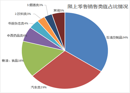 ㈣限额以上企业主要零售类值实现增长。15个零售类值14个实现增长。其中,石油及制品类(占比34.2%)增长87.6%,汽车类(占比29.3%)增长96.4%,粮油、食品类(占比15.5%)增长10.1%,中西药品类(占比6%)增长56.2%。