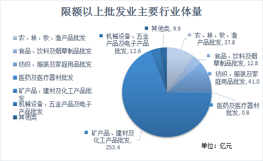 从限额以上批发零售业的产品构成体量来看,从大到小依次为矿产品建材类(销售额253.4亿元,同比增长26.7%,占限上批发业商品销售额的67.5%);纺织、服装及家庭用品批发类(销售额41亿元,同比增长2.6%,占限上批发业商品销售额的10.9%);农、林、牧、渔产品批发类(销售额37.8亿元,同比下降3.3%,占限上批发业商品销售额的10.1%) 。