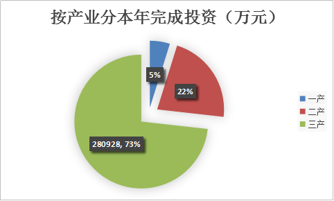 --三次产业增长“两高一稳”。第一产业完成投资1.85亿元,同比增长1.9倍;第二产业完成投资8.42亿元,同比增长1.0倍;第三产业完成投资28.09亿元,同比增长11.7%。分别占投资总额的4.8%、21.9%、73.3%。第二产业投资异军突起,工业投资效果显现。