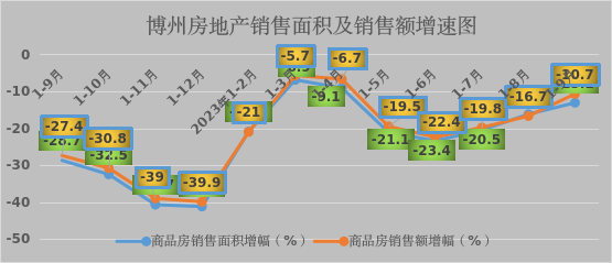 ㈠ 房地产销售市场逐步回暖。1—9月,博州商品房销售面积22.95万平方米,同比下降13.1%,降幅较1—8月收窄3.1个百分点。其中,住宅销售面积21.16万平方米、下降13.2%,降幅较1—8月收窄3.0个百分点。商品房销售额9.98亿元、下降10.7%,降幅较1—8月收窄6.0个百分点,其中,住宅销售额8.7亿元,下降11.4个百分点,降幅持续收窄。