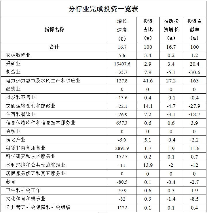 ㈣三大行业占比近七成。电力热力燃气及水的生产和供应业、交通运输仓储和邮政业、水利环境和公共设施管理三大行业累计完成投资同比增长33.9%,拉动全州投资增长20.5个百分点,投资贡献率123.0%。