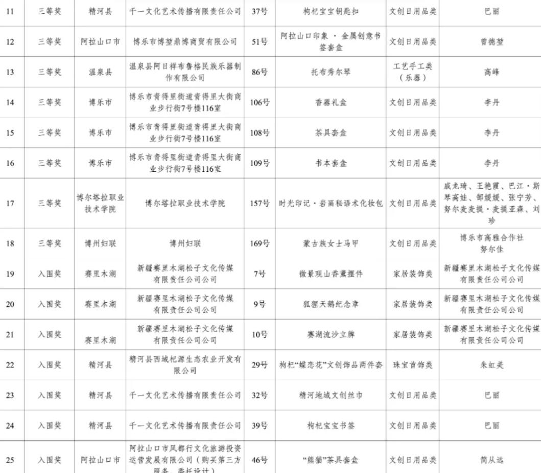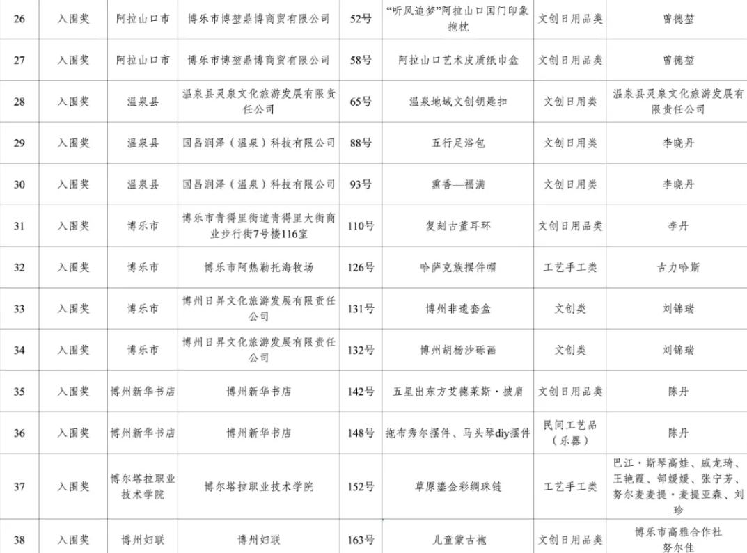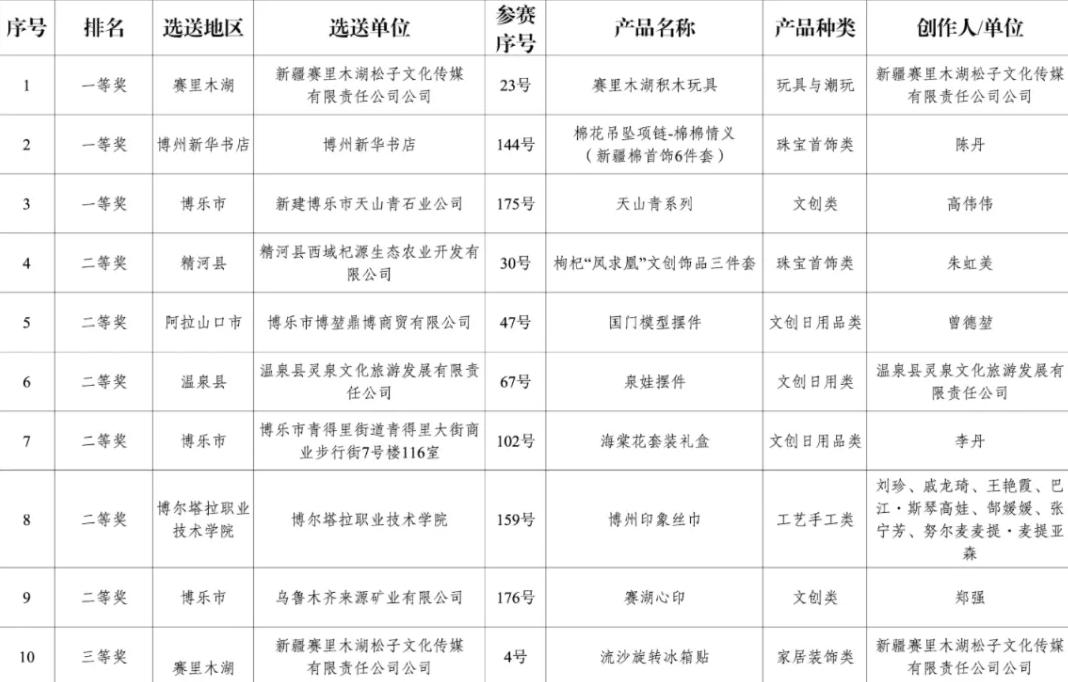 9月26日至27日,博州举办首届旅游文创产品设计大赛。经过专家组多轮评审,从参赛的176件文创产品中评选出获奖作品38件,其中一等奖3件,二等奖6件,三等奖9件,入围奖20件。现将评选结果公示如下: